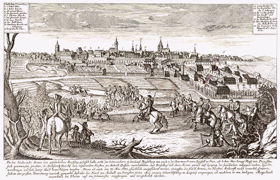 Saxony was ruled at that time nominally by the Elector August II, but in practice by the wily Count Bruhl, whose handling of political matters was disastrous, his main talent being in plundering the State finances. It was due to his political vacillations that Saxony was drawn into the Second Silesian War, in which Leipzig was besieged and threatened with destruction. A key figure among Frederick's generals was Leopold von Dessau, an aged combatant known as the “Old Dessauer” whom Frederick found somewhat difficult to manage, posting him for most of the campaigning years up to 1745 in command of an army of observation on the Saxon frontier. The Old Dessauer was now over seventy, but his last campaign was destined to be the most illustrious of his long career. A combined effort of the Austrians and Saxons to mount a winter campaign and move towards Berlin led to a hurried concentration of the Prussian forces. Frederick managed to check the main Austrian army in Silesia, then hastened towards Dresden to take on the Saxons. But before he had arrived, Leopold, no longer in observation, had decided the war by his overwhelming victory over the Saxons at Kesselsdorf (December 14, 1745). It was his habit to pray before battle, for he was a devout Lutheran. On this last battlefield his words were, "O Lord God, let me not be disgraced in my old days. Or if Thou wilt not help me, do not help these scoundrels, but leave us to try it ourselves." His successful taking of Leipzig was it must be admitted, somewhat facilitated by the practical burgers of Leipzig, who gallantly surrendered rather than have their fine city destroyed. The conquerors however made their point by occupying the Leipzig Garrison over Christmas 1745, withdrawing at the start of the New Year. On the instructions of the Leipzig City Council, Bach composed a celebratory/thanksgiving cantata, BWV 192 Nun Danket Alle Gott, which was performed on January 9th, 1746. Leipzig and Saxony were however required to pay onerous fines/reparations, impoverishing both city and state. Just one example of the effects of the war are recorded in the history of the Saxon village of Nassau. A contract was signed in 1745 in which the congregation of Nassau village church committed themselves to an expense of 800 Taler for a new Silbermann organ, with 200 Taler in the church funds and little idea as to where they would find the rest. There was worse to come. With Prussia's invasion of Saxony in the Second Silesian War, the region found itself bearing the burden of some 2,000 Prussian soldiers, all of whom expected to be quartered and fed by the occupied inhabitants, incurring a final debt to the region estimated at some 3,000 Talers. Work began on the organ in the middle of April 1748, with completion and testing on August 4th of that same year. Precisely how the impoverished congregation was able to meet the payment is not recorded, save that the Over-Consistory in Dresden apparently came to the rescue. Our contemporary drawing from 1746 shows the prudent burgers of Leipzig surrendering to Leopold. |