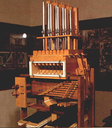 The Museum is located in the fine medieval castle just above the town (on the right in the picture), dating from 1585-1588. The Museum was founded in 1983 by, and based on the research of, Werner Müller (1924-1999) whose two books are the definitive reference works on the life and work of Gottfried Silbermann. The opening of the Museum coincided with and celebrated the 300th Anniversary of Silbermann's birth. As an "introduction" to Silbermann's work, beautiful, large-format photos illustrating every extant Gottfried Silbermann organ are hung around the walls of the museum's foyer. The Museum contains numerous valuable and original documents of specifications, contracts and letters pertaining to Silbermann's life and his various commissions. A full-size working exhibit by Jehmlich organ-builders of Dresden shows simply and clearly the operation of an organ from bellows through the action of stops and keys, to the pipes.