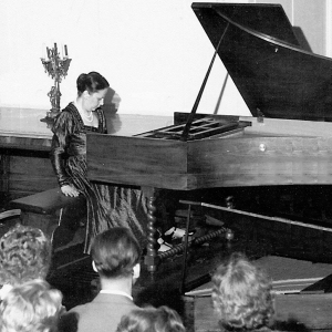 Borrowing the title from a series of keyboard pieces by CPE Bach, Concerte für Kenner und Liebhaber, Isolde instituted a series of concerts on the fortepiano, an instrument which at that time had fallen into neglect. The Wiener Neueste Nachrichten, February 26, 1937, reported: "The first concert for connoisseurs and amateurs must be emphasised to be something entirely special. It succeeded in moving to enthusiasm the discerning Viennese musical public. Isolde Ahlgrimm, who has already achieved notable success on the modern piano, brought to the hammerklavier great ability and fine musicianship. Her technique, personality and appearance are as though made for this instrument." Her influence was to have a long-lasting effect: Peter Watchorn, Isolde Ahlgrimm's last student and biographer, was told recently by Paul Badura Skoda that it was his and Jorg Demus' attendance at one of Isolde's Mozart Cycle concerts in 1949 that convinced them to take up the fortepiano. She then moved on to institute a series of concert-lectures featuring the harpsichord, playing always from memory. The photo on the right above, and below, was taken during a lecture-recital of the Art of the Fugue in 1952. See her detailed notes on keyboard performance of the Art of the Fugue. |